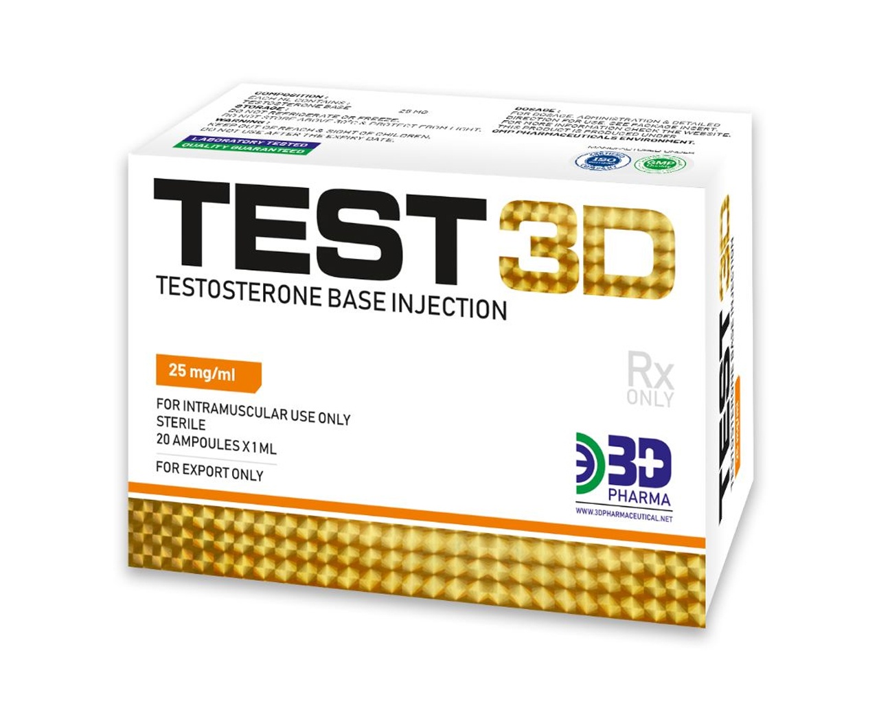 Test 3D 25 mg (Testosterone base) is pure testosterone with no ester attached. Its half-life is only 2 hours! This is the most potent form of testosterone available. PHARMATEST 100 has a reputation for being used as pre-workout stimulant to increase aggression and power for extreme training sessions and competition. Please notice, this is not oil, but a water suspension.